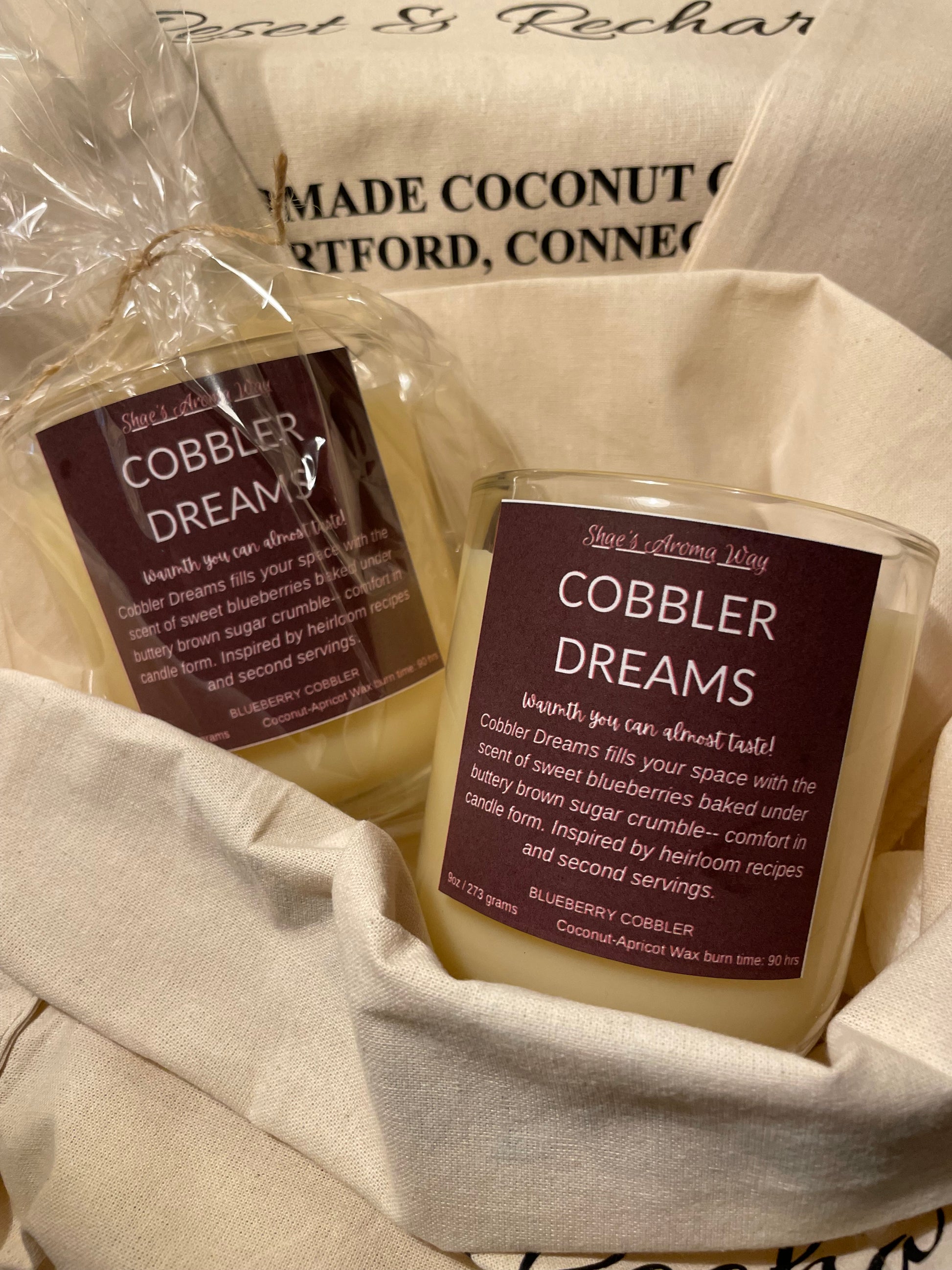 Cobbler Dreams is our best-selling comfort scent: warm, nostalgic, and just sweet enough. Notes of ripe blueberries, golden pastry crust, and a hint of vanilla sugar come together in this hand-poured coconut apricot wax candle to evoke the feeling of home, memories, and dessert right out of the oven.